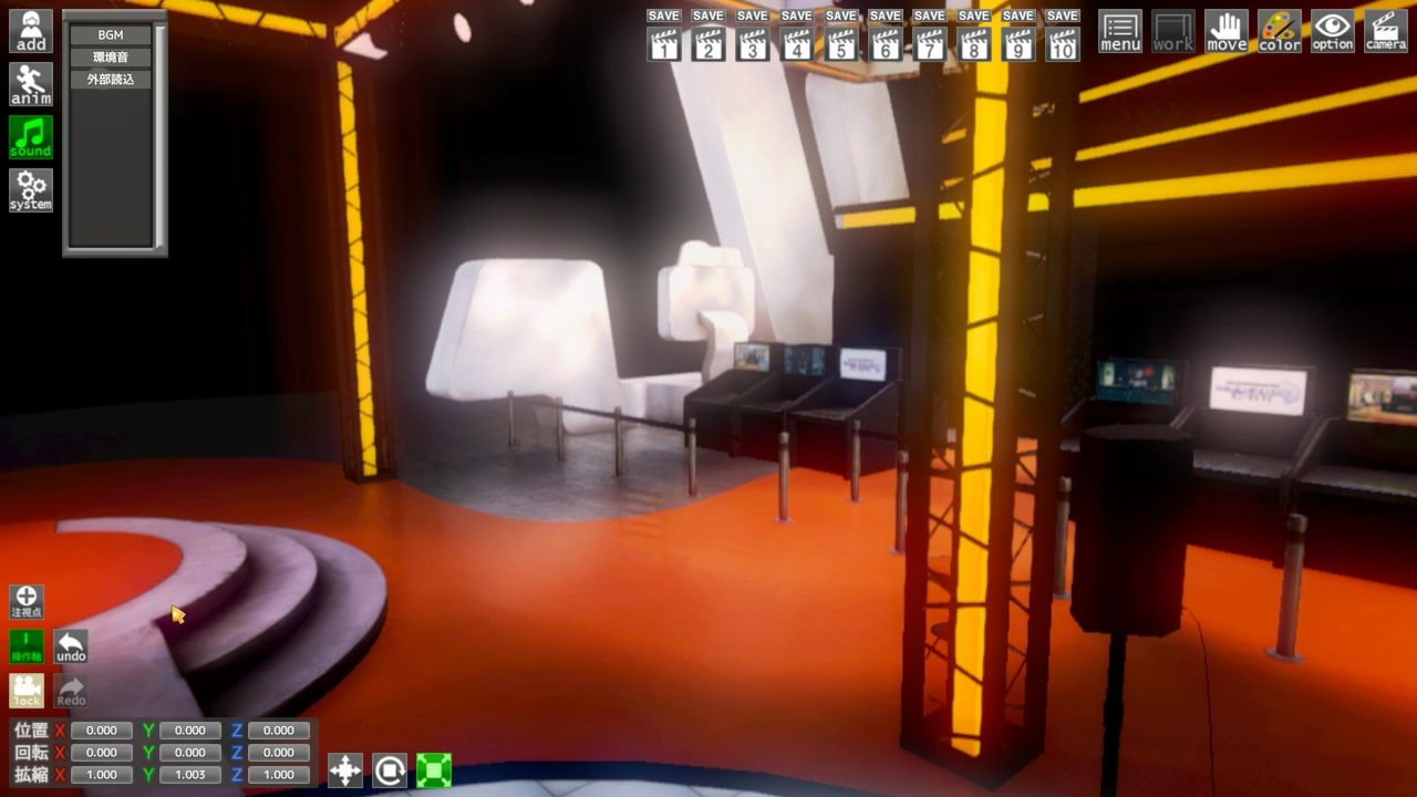 ステ-ジの中にキャラクタ-を自由に配置して、様々なポ-ズや動きに